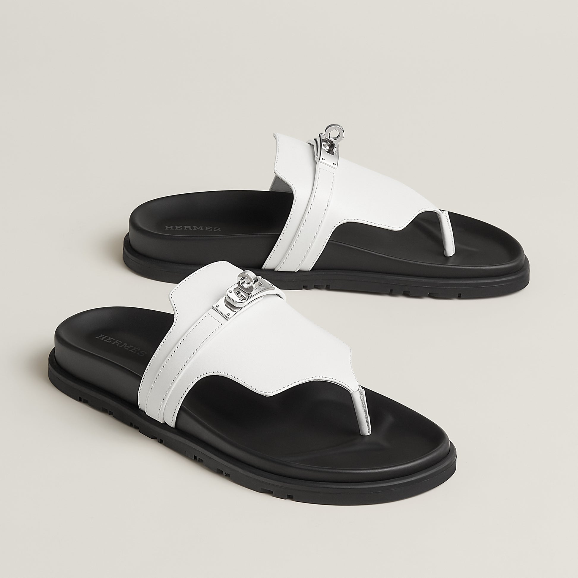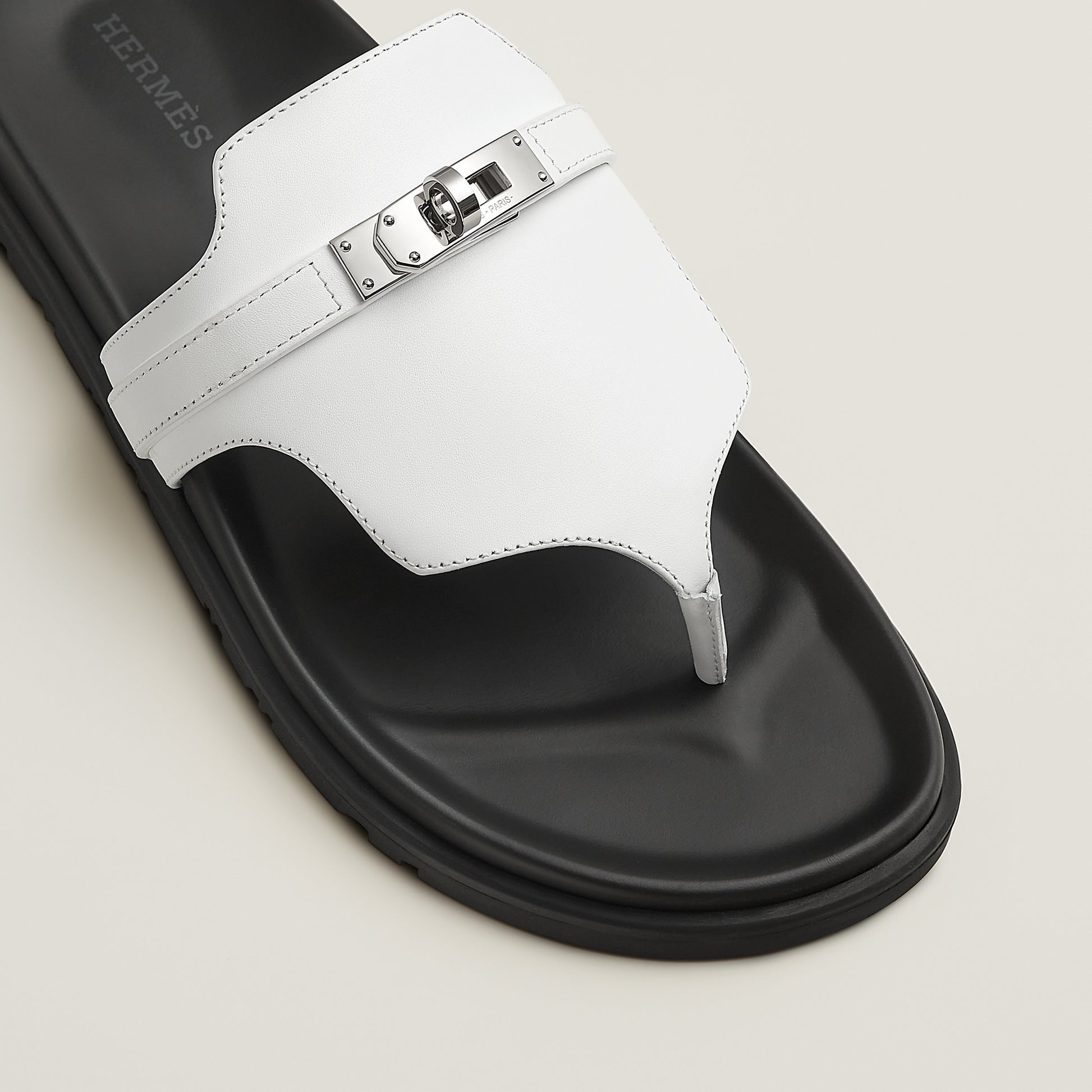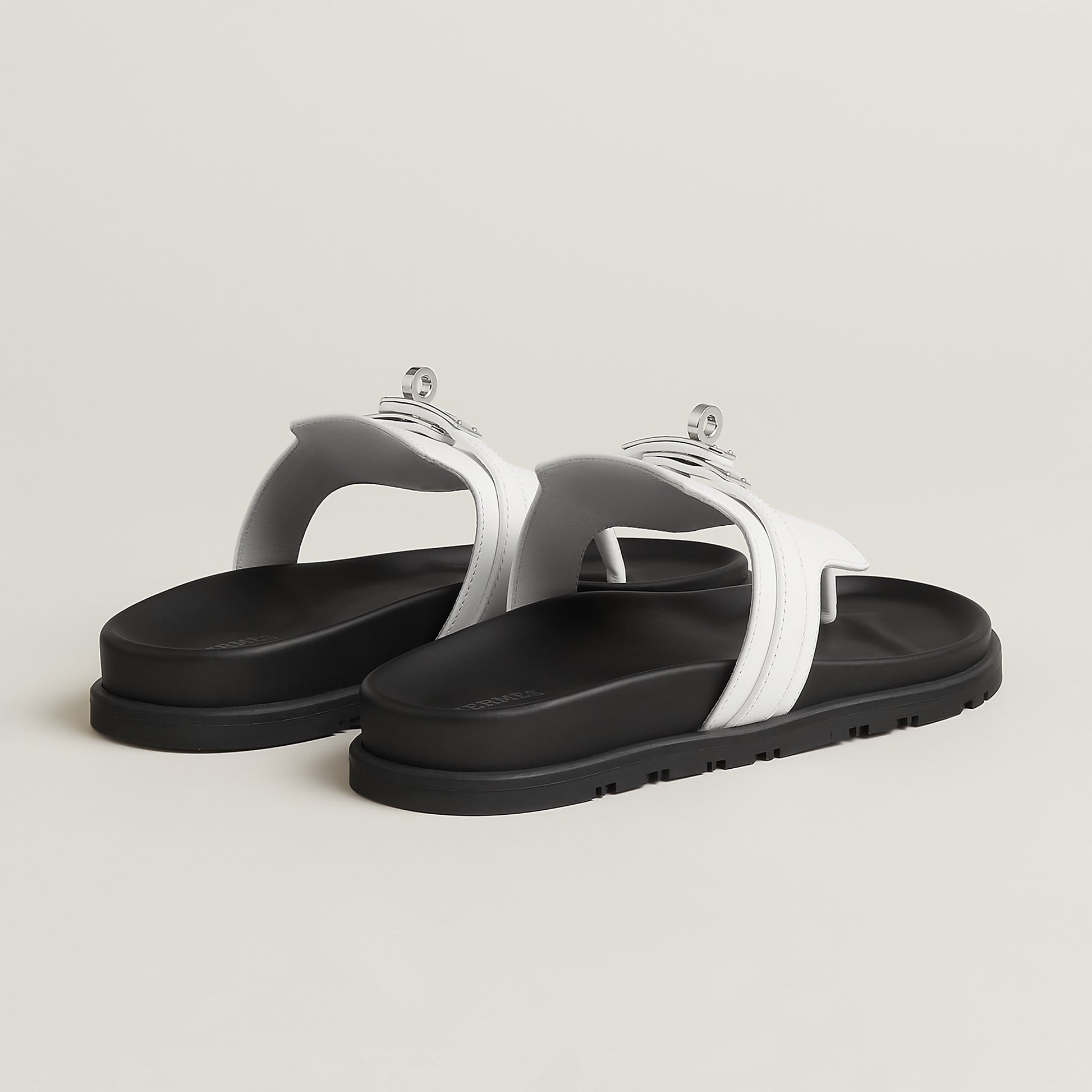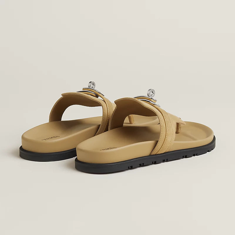 Sandale aus hochwertigem Leder mit anatomisch geformter Sohle für optimalen Komfort. Das ikonische Verschlussdetail aus Metall setzt einen markanten Akzent und unterstreicht den eleganten, urbanen Look des Designs.